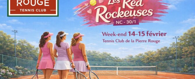TMC Dames “Les Red Rockeuses” (NC à 30/1) au Tennis Club Pierre Rouge : week-end 14–15 février dès 15h (samedi) + toute la journée (dimanche). Tournoi convivial sur terre battue, format court FFT. Places limitées à 12. Inscription Ten’Up avant le 8 février.
